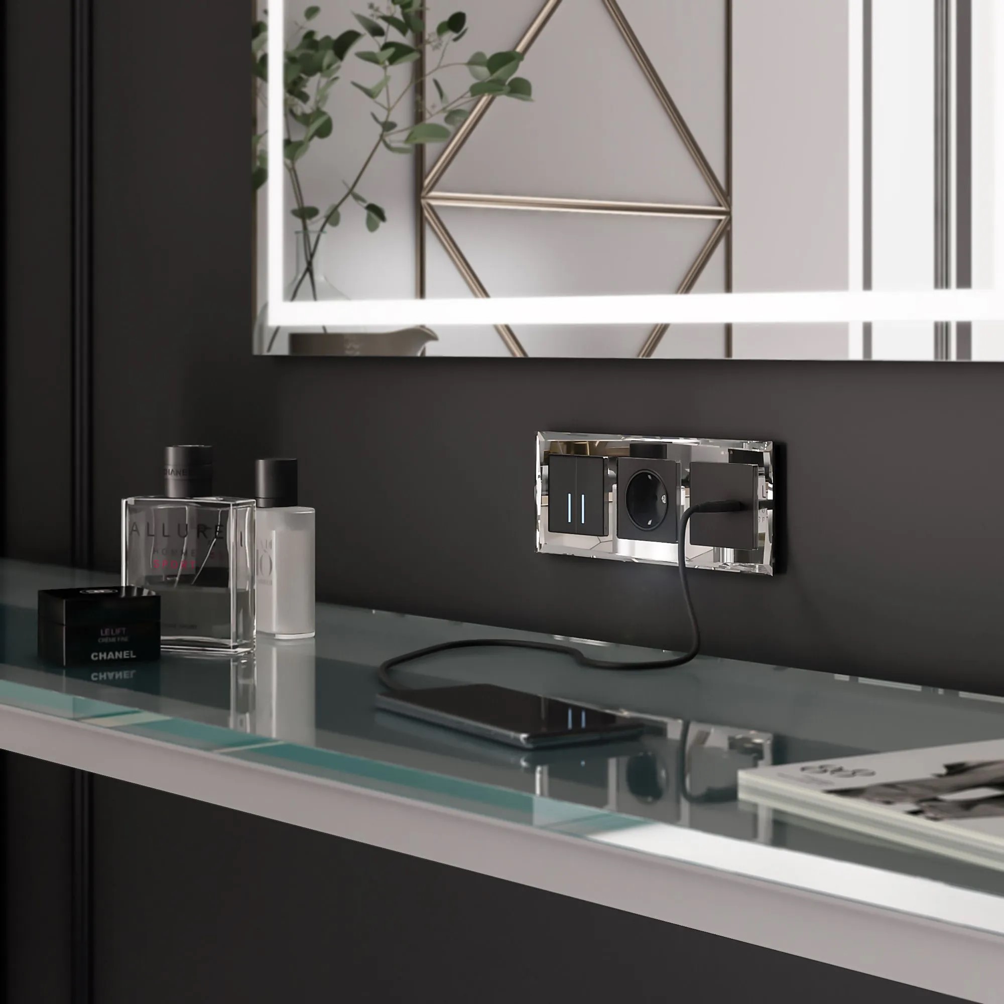 • Функционал: можно использовать умные решения (терморегулятор, USB), но в металлическом или зеркальном исполнении.