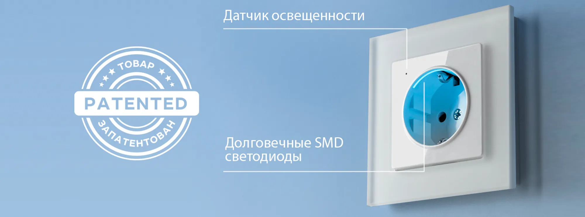 Розетка с подсветкой оснащена уникальной запатентованной технологией - автоматической подсветкой розеточного гнезда. Подсветка в розетке включается с наступлением темноты в помещении.